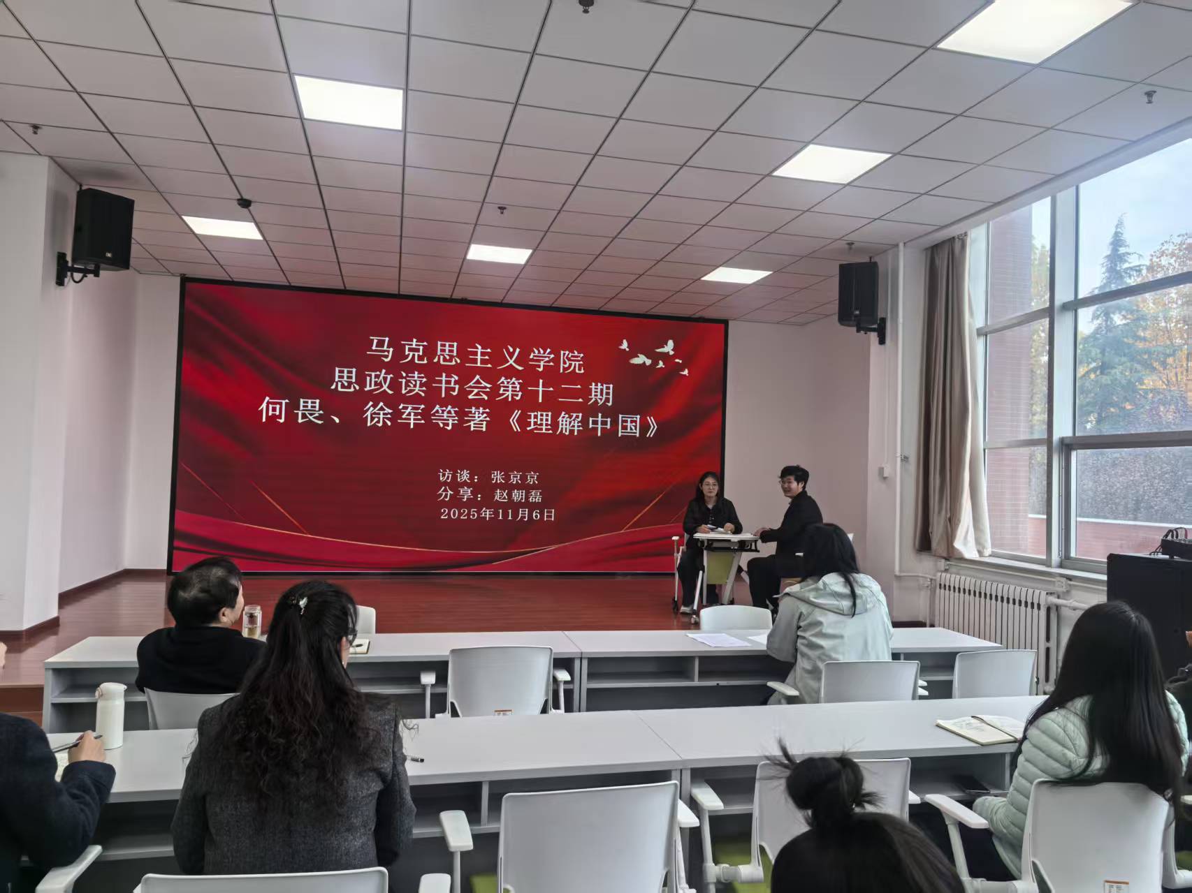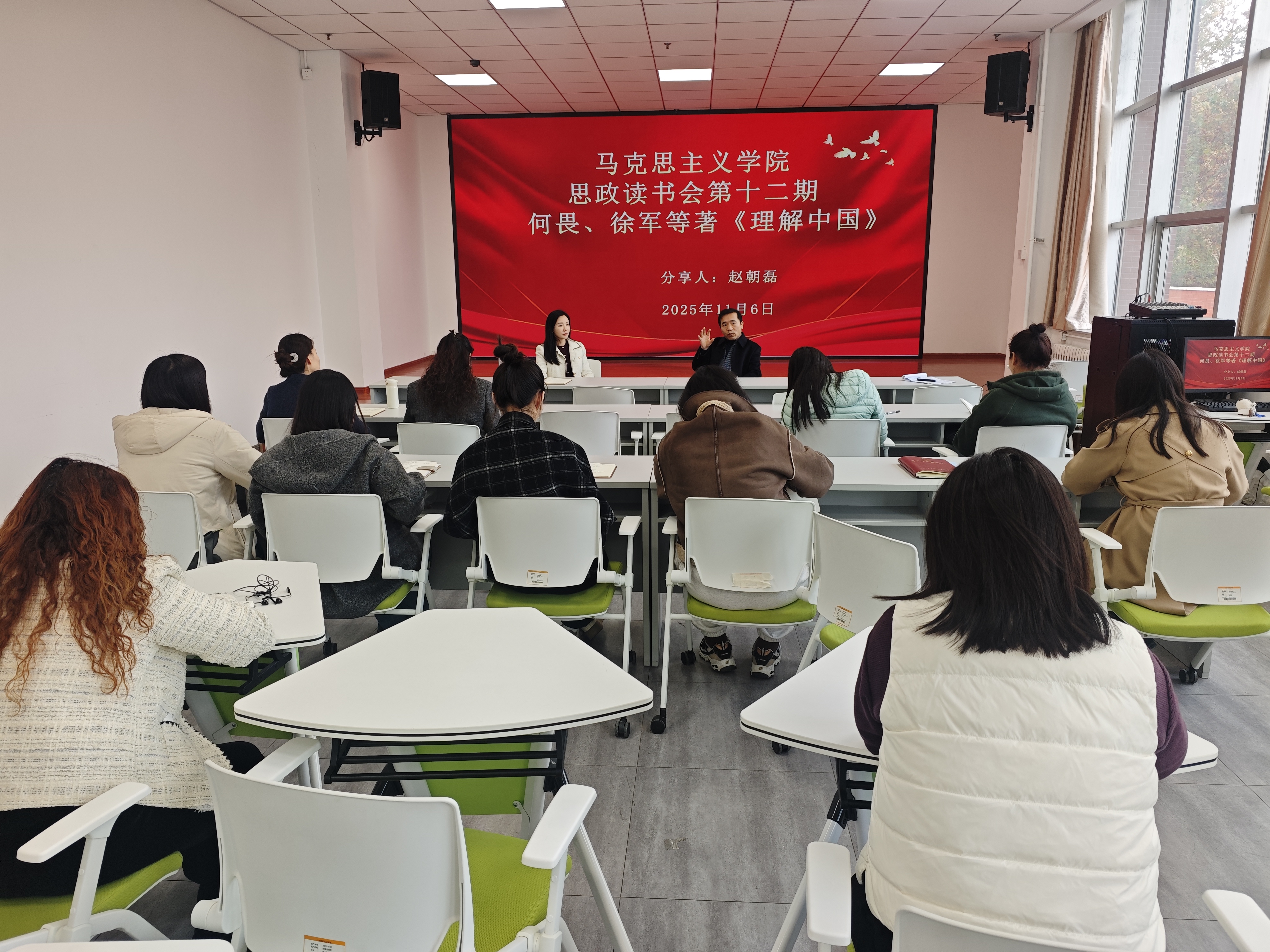 2025年11月6日下午,马克思主义学院在行政楼二楼思政实训室举行本学期第十二期思政读书会,马克思主义学院全体教师参加。本次读书会由考秀坤老师主持,赵朝磊老师主讲,她分享的书目是何畏、徐军等著的《理解中国》。