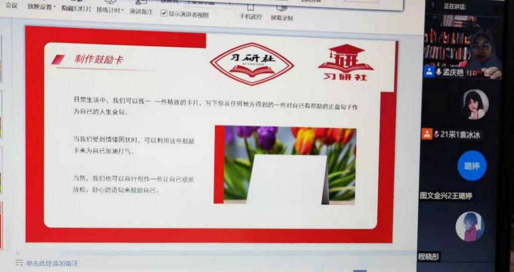 为了更好了解和帮助学生疏导线上授课期间和封校后的心理和情绪波动,引导社员们积极、健康、科学面对疫情带来的种种不便,习研社指导教师孟庆艳于3月26日晚上,和习研社的社员们相约腾讯会议,开展了一次以“心心相印 叶叶联芳”为主题的交流会。