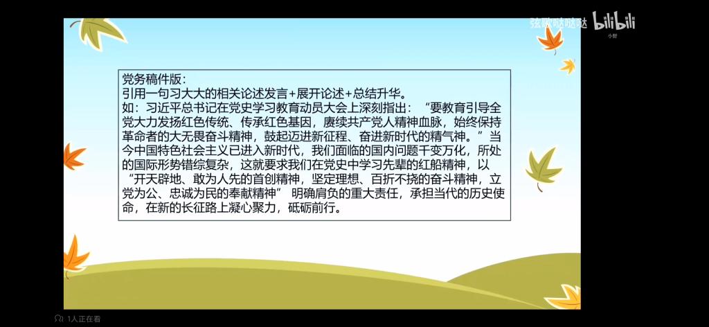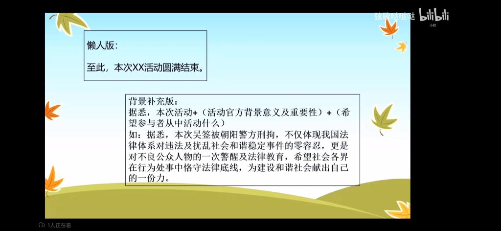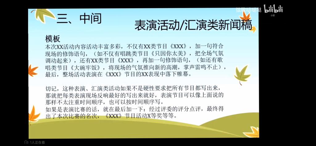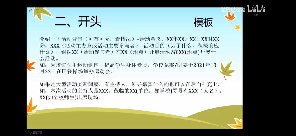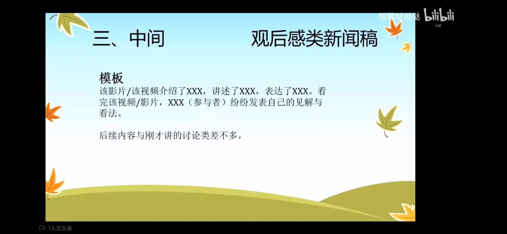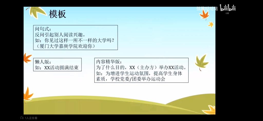 此次交流分享主要是通过观看视频方式进行,包括四部分内容:题目,开头,中间内容以及结尾,并在每一部分赠予模板供同学们参考。在中间内容方面,将其分为三类-讨论类,观后感,活动类。在结尾升华方面,结合习近平总书记的相关金句话语,联系当前实际情况进行总结。