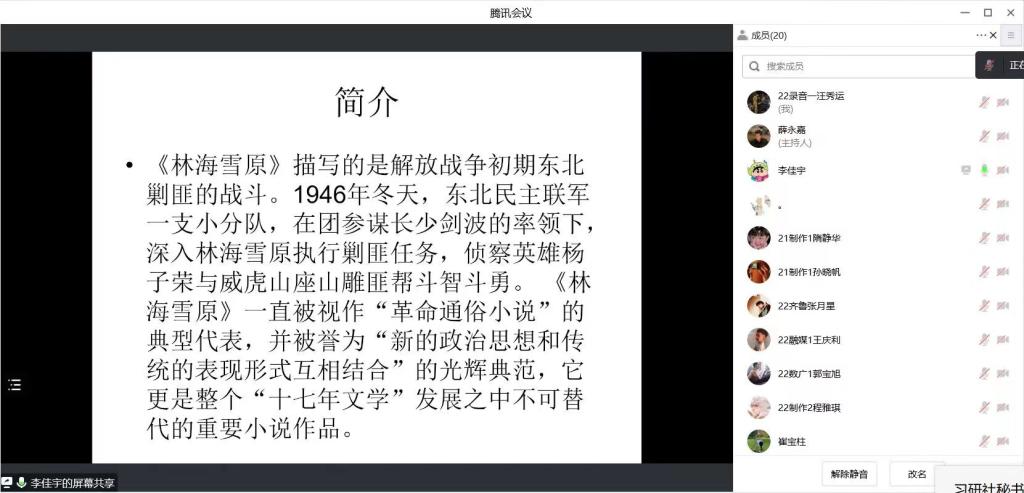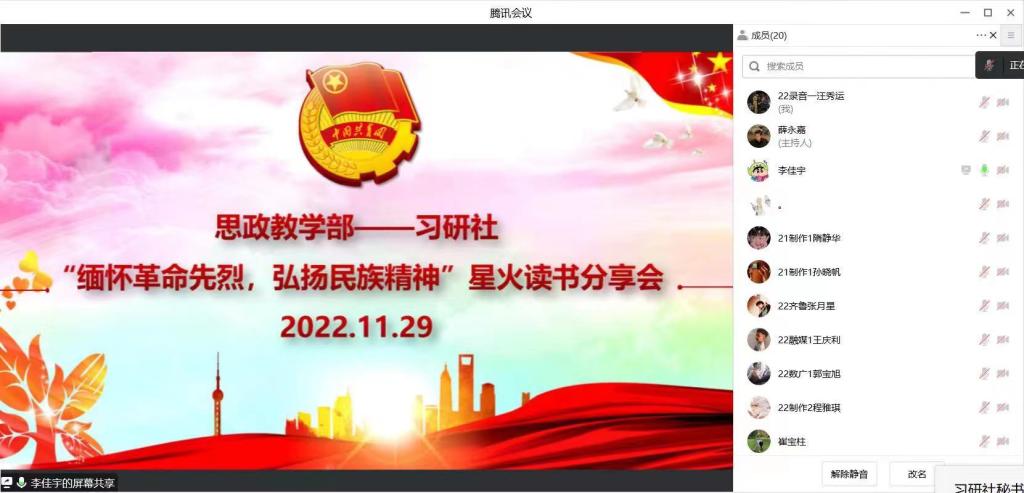 为营造浓厚的校园文化,培养学生积极向上的学习兴趣,让同学们从阅读中学习红色知识,弘扬红色精神,习研社于2022年11月29日晚上5:00-6:00,通过腾讯会议线上举行了第一次星火读书分享会,本次活动由社长薛永嘉主持,习研社部分社员参与。