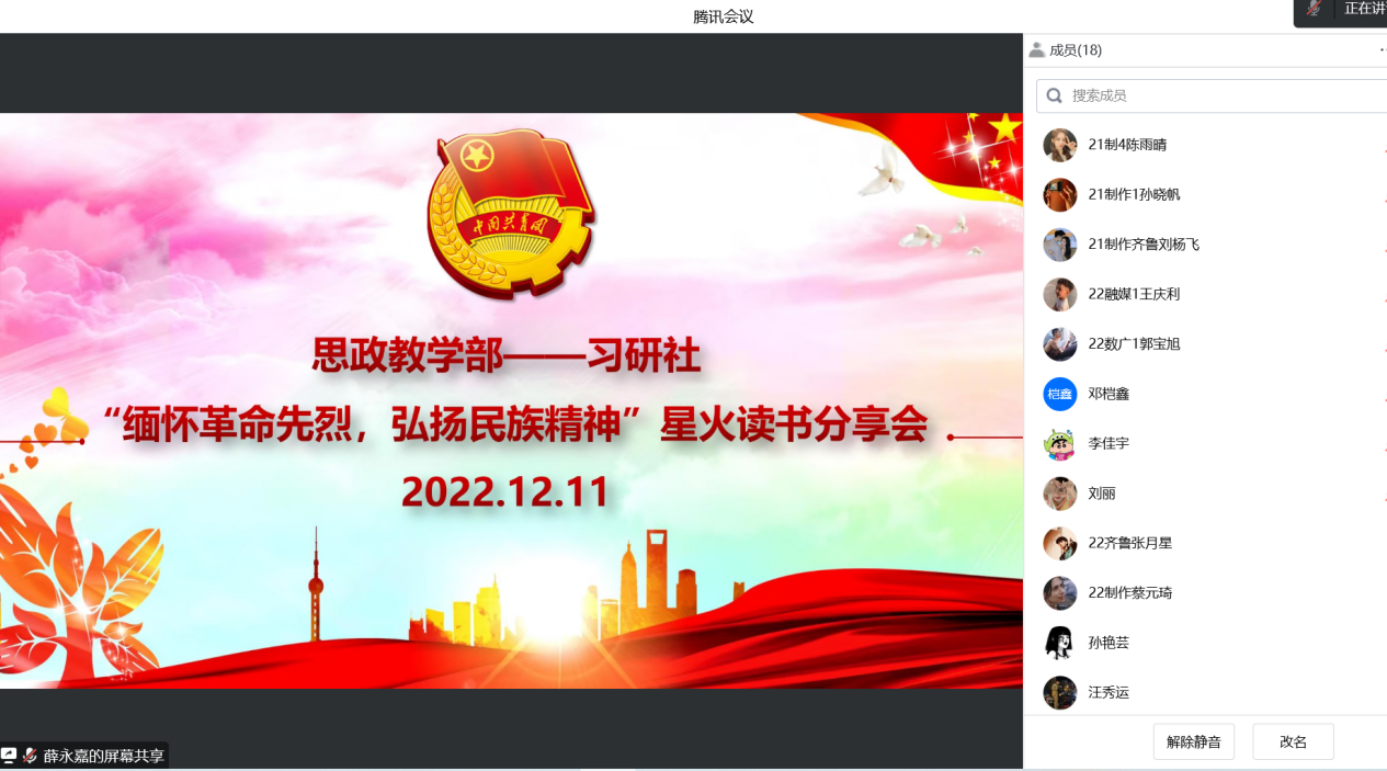为把红色文化引进校园、走入学生的心灵,积极营造红⾊氛围,把红色资源转化为教育资源,用红色⽂化引领学⽣健康成长,习研社在社团范围内周期性持续开展红色读书分享会。2022年12月11日晚上8点,习研社通过腾讯会议准时线上举行了第三次星火读书分享会,本次活动由社长薛永嘉主持,习研社部分社员参与。