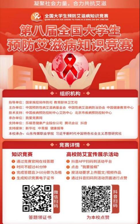 2023年12月1日是第36个“世界艾滋病日”。为贯彻落实党中央、国务院决策部署,推进联合国2030年终结艾滋病流行可持续发展目标的实现,积极响应“凝聚社会力量,合力共抗艾滋”2023国家防艾宣传主题,实施健康中国战略,提高青年学生对艾滋病的了解,普及艾滋病防治知识,持续推进艾滋病防治宣传教育进校园,习近平新时代中国特色社会主义思想研究社于2023年11月-12月承办了《第八届全国大学生预防艾滋病知识竞赛》。