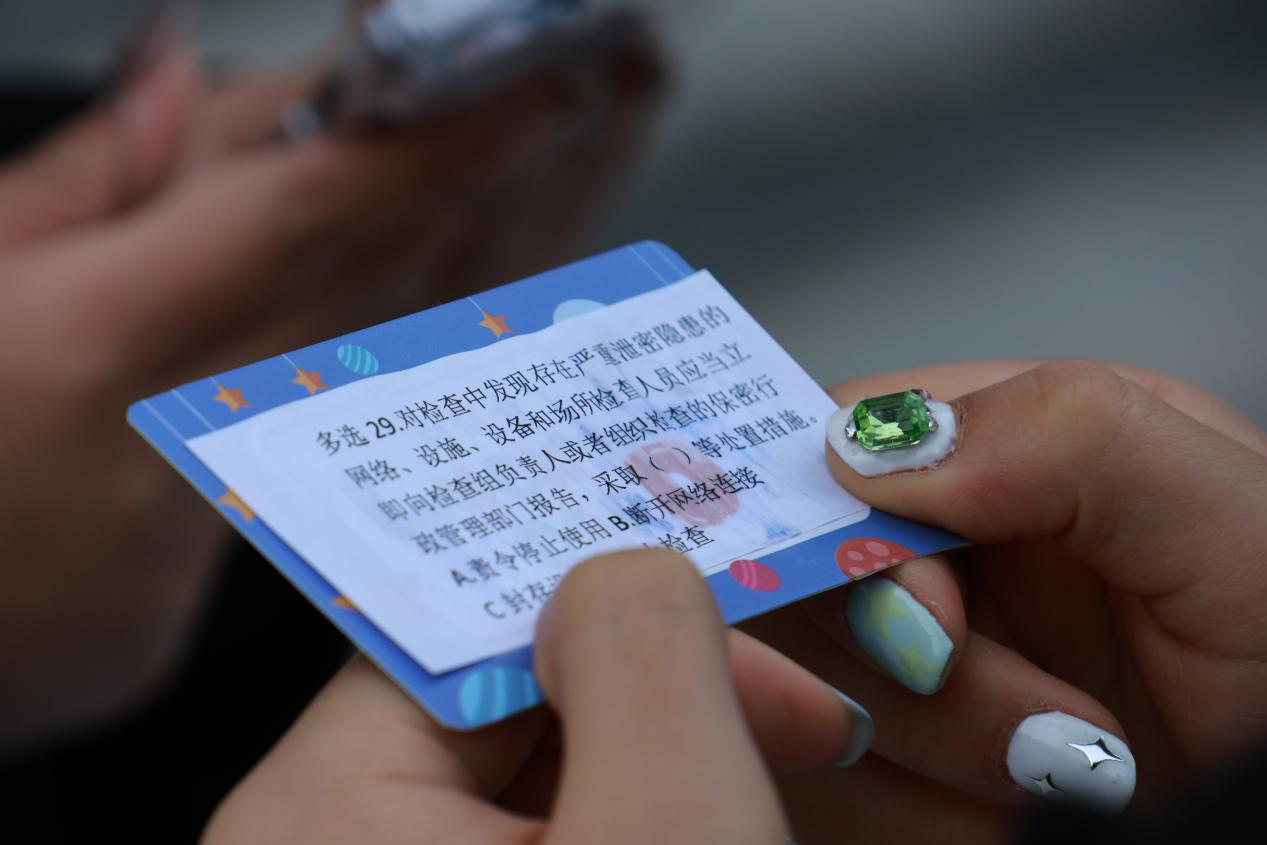 活动现场,社团负责人韦艳茹、姚皓凯向同学们详细介绍了《保密法》的重要性和具体内容,通过案例讲解让大家深刻认识到保密工作的必要性。随后由社团工作人员引导同学们领取刮刮乐,回答刮刮乐上的《保密法》问题,回答正确的同学现场领取了工作人员准备的精美礼品一份。