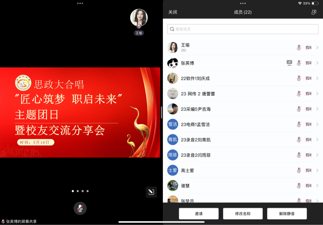 为进一步发挥优秀校友的榜样示范作用,加强校友联络,2024年5月16日晚,思政大合唱于线上举办了“匠心筑梦,职启未来”主题团日暨校友交流分享会。活动由社团团支书张英博主持,社团21级校友和22级、23级社团成员参与。
