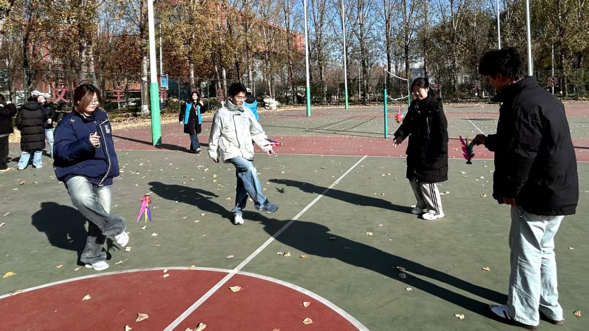 活动负责人有序发放毽子、跳绳,带领同学们完成基础热身动作,并练习踢毽子与跳绳的基础动作要领,帮助大家快速融入活动氛围。随后以5-6人为一组结伴练习,大家互相鼓励,在探索中解锁运动新技能。同时,为了检验同学们的练习成果,还设置了“计数挑战赛”:1分钟单人踢毽子比谁踢得更多,5分钟跳大绳比谁跳得更久,使大家在紧张又欢乐的角逐中感受运动的激情与团队的活力。