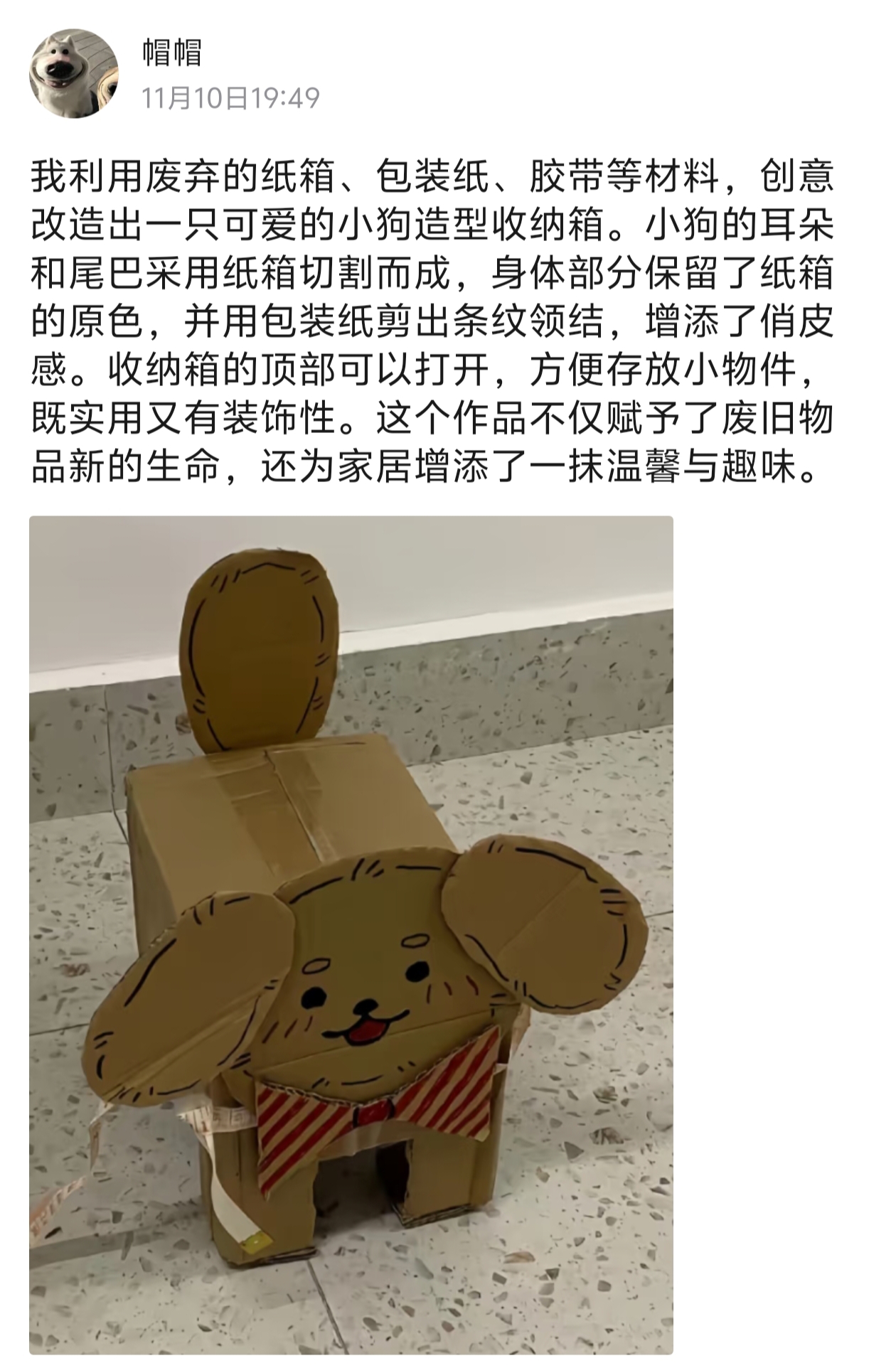 为践行绿色低碳理念,激发青年大学生的创新思维与动手能力,行知社于2025年11月10日至11月14日举办“绿色创想·变废为宝”线上环保创意活动,旨在鼓励同学们发现生活中的废弃物品价值,通过创意赋予其新的生命。“绿色创想·变废为宝”活动不仅是一次手工制作的体验,更是环保教育与创新实践的融合。通过双手与巧思,同学们重新发现废弃物的潜在价值,传递了绿色循环的生活态度,有助于营造勤俭节约、崇尚创新、绿色和谐的校园文化氛围。文字:刘昭君图片:刘昭君编辑:赵朝磊审核:初审:刘萌终审:王冠松来源:马克思主义学院