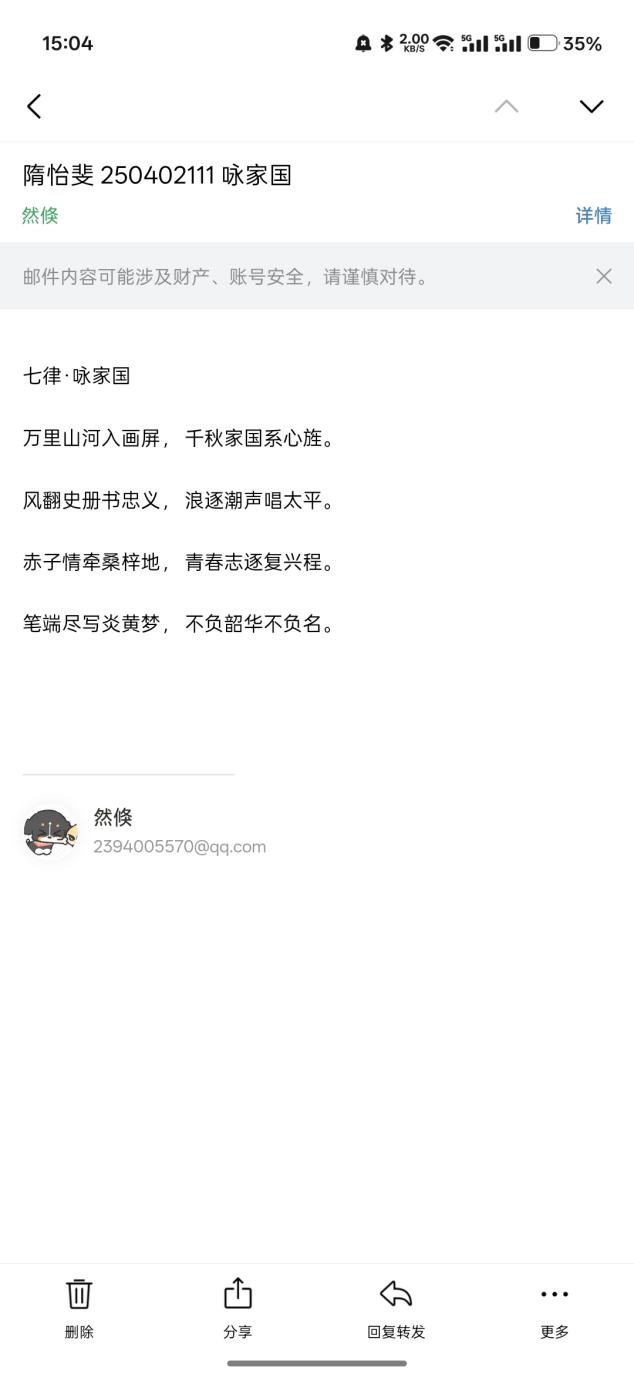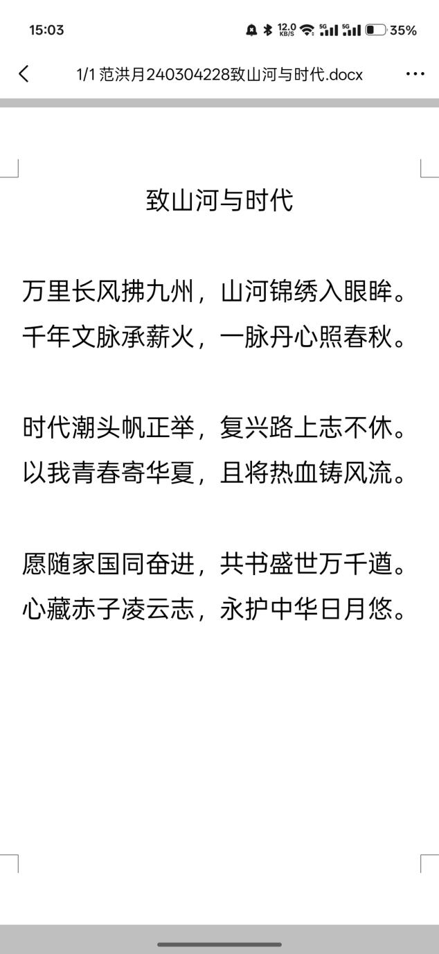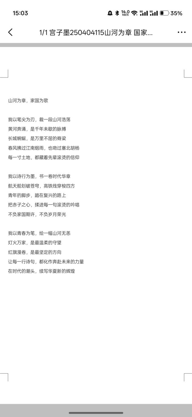 为弘扬爱国主义精神,涵养家国情怀,2026年3月23日至3月27日,行知社成功举办“诗咏山河,笔颂家国”爱国主题诗歌创作征集活动。本次活动鼓励青年学生以诗歌、散文、短视频等形式,抒发对祖国壮丽山河、人文精神与发展成就的热爱与礼赞。本次活动为学生搭建了技术与人文融合的实践平台,有效提升了学生的数字素养与创意表达能力,激发了创新热情与社会责任感,进一步推动了校园美育与爱国主义教育的深度融合。文字:刘茹洁图片:刘茹洁编辑:赵朝磊审核:初审:刘萌终审:王冠松来源:马克思主义学院