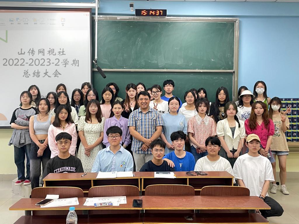 2023年6月8日,山传网视社在教学楼3116教室举行了2022-2023学年第二学期期末总结大会暨社团换届。出席会议的有考秀坤、陈忠琦老师以及社团全体成员。
