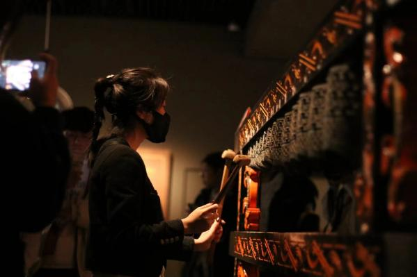 同学们跟随讲解员参观了章丘博物馆的三个展厅,在参观过程中,工作人员用博物馆所陈列的编钟模型,为大家敲奏了一首《茉莉花》。同学们也亲自演奏编钟,去感受来自千年的绝响。