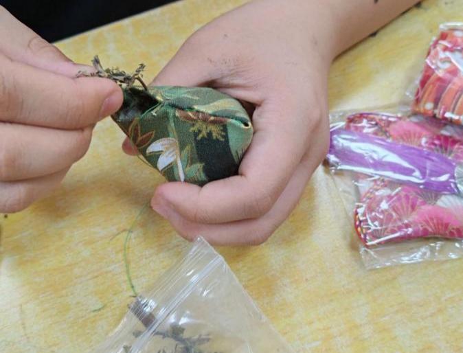 同学们学习了端午节的起源与历史,了解了端午香包的由来和意义,随后,大家拿起手中的材料包,一起缝边、填香料,一个个立体、精美的香包呈现在眼前。