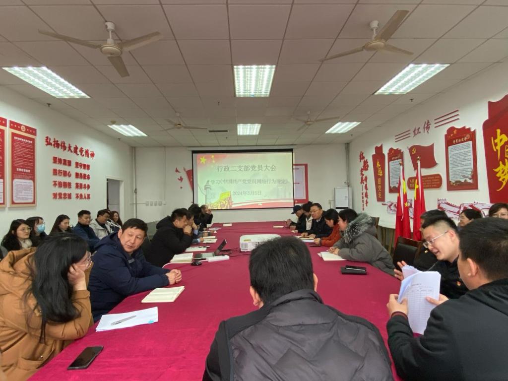 2024年3月5日下午,直属行政二支部全体同志在行政楼B608召开全体党员大会。会议第一项,全体同志进行了以网络安全为重点的主题党日学习活动,支部书记董以敏带领同志们学习了《中国共产党纪律处分条例》。会议第二项,开展2023年度民主评议党员工作,全体同志以严肃认真的态度进行自我评价、以公平公正的态度进行互相评价,此次民主评议党员工作开展程序规范,取得了良好的效果。